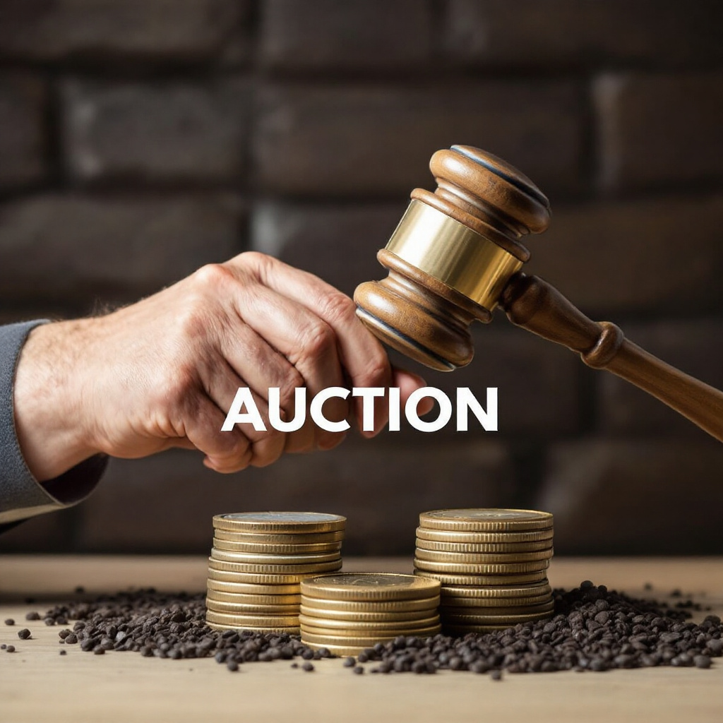 Property for sale by Auction A hand holding a wooden gavel above a stack of gold coins and scattered black beans against a dark stone wall. The word “AUCTION” is overlaid in bold white letters across the image. Presented by Palace Auctions