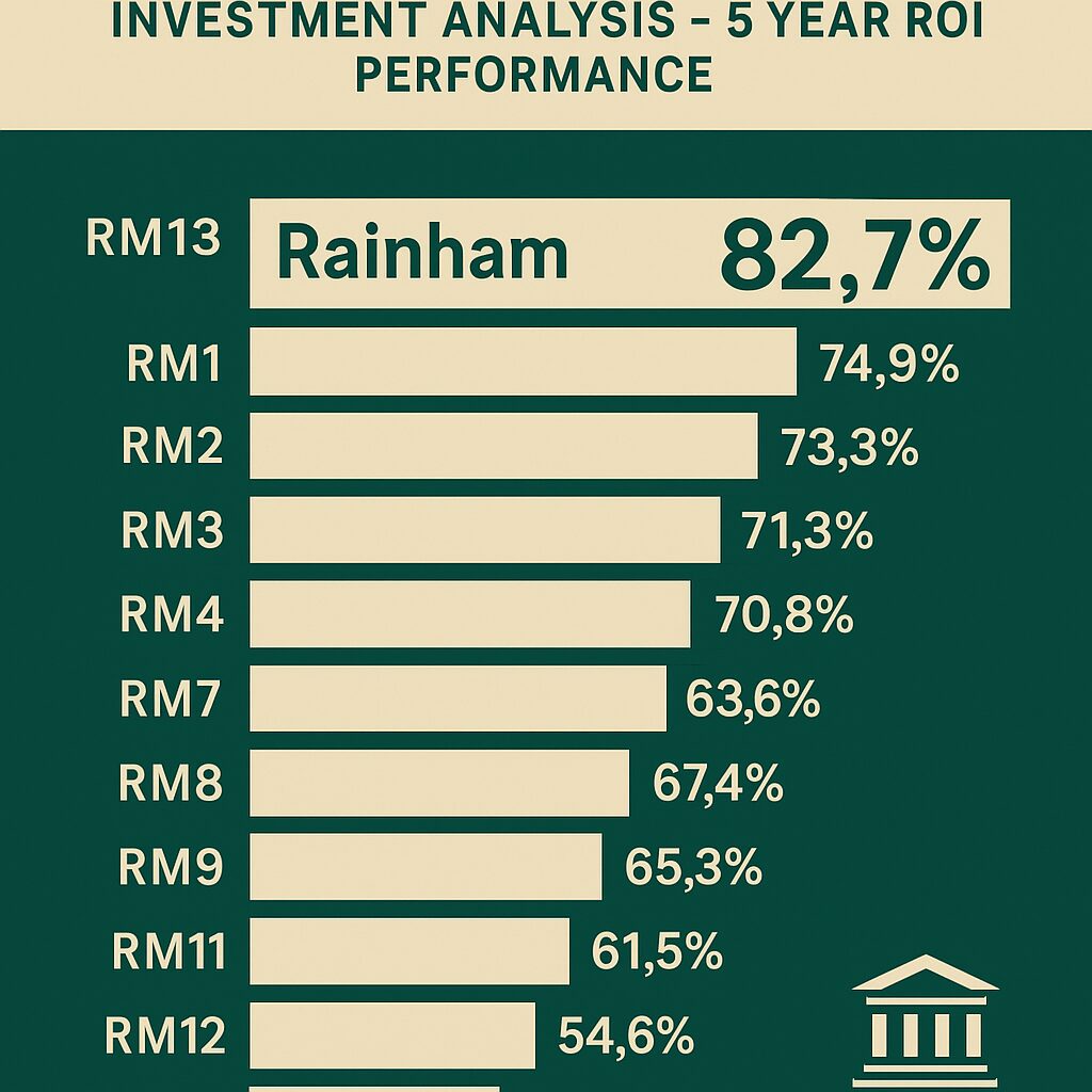 Romford leads Havering’s property investment landscape with the highest projected 5-year ROI, closely followed by Rainham and Gidea Park. Areas with Elizabeth Line connectivity and major regeneration projects offer the strongest growth prospects, while family-oriented suburbs provide stable, moderate returns.
