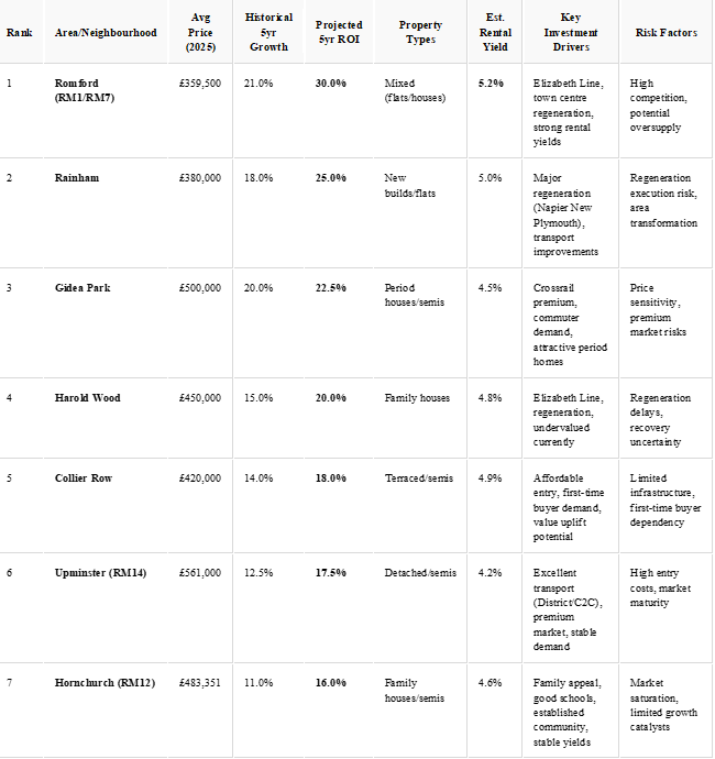 - Regeneration zones (Romford, Rainham, Harold Hill) offer the highest growth potential but carry execution and transformation risks.