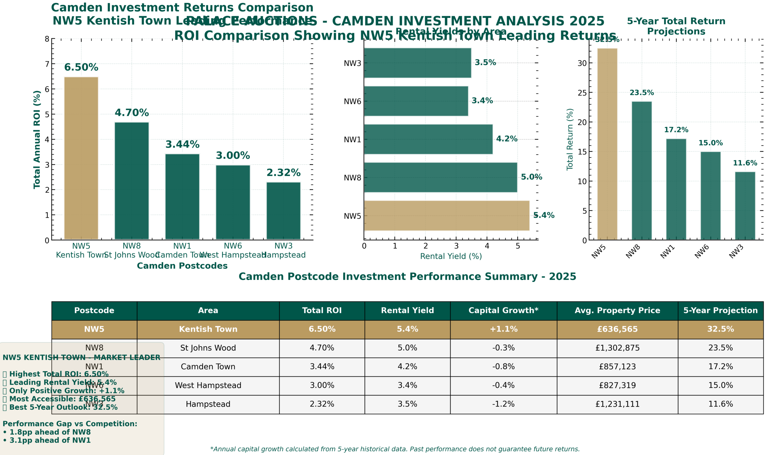This dashboard provides a clear, data-driven comparison of investment returns across Camden’s major postcodes, confirming NW5’s market leadership for both income and growth-focused investors.
