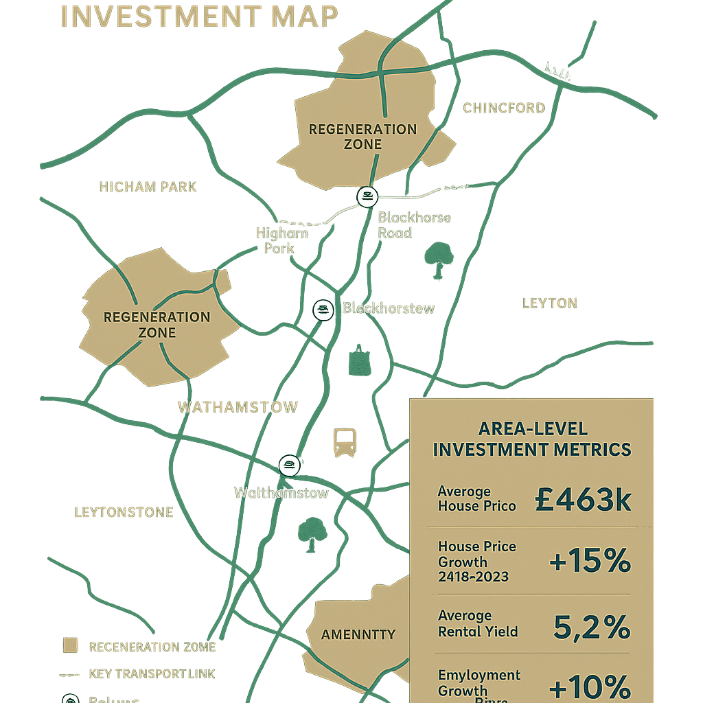 Waltham Forest is one of London’s most dynamic boroughs for property investment, with multiple regeneration zones, strong price and rental growth, and a vibrant auction market. The investment map above visually synthesizes all key data—helping investors and buyers target the best opportunities in a rapidly transforming area.