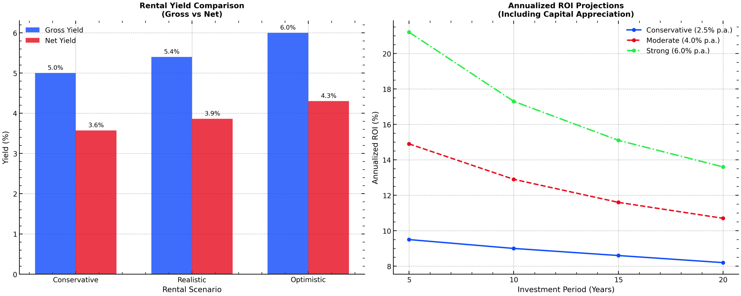 Figure: Rental Yield Comparison & ROI Projections (Conservative, Moderate, Strong Growth)
